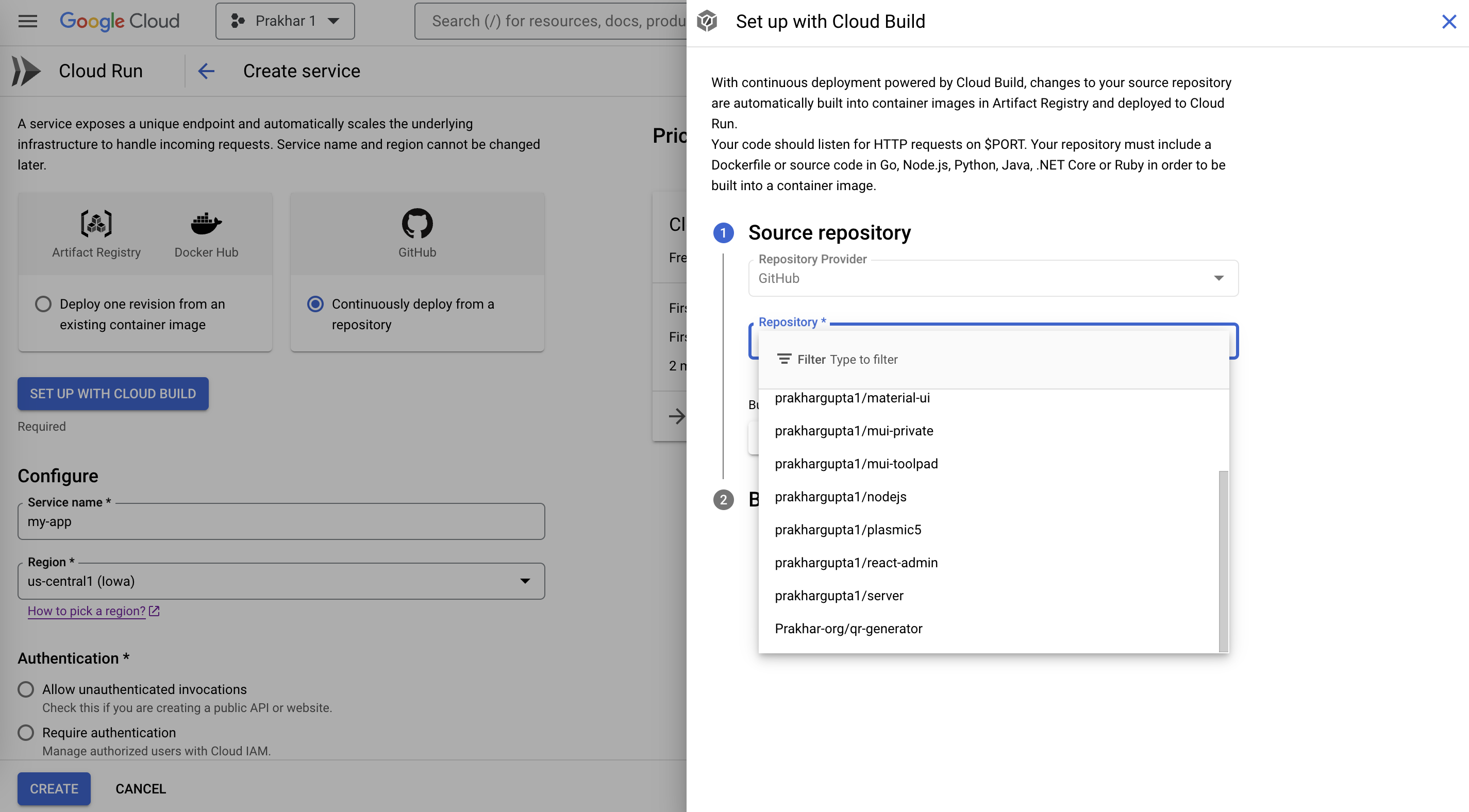 - In the Create service UI, choose Continuously deploy from a repository and give a name to your service from the Service name input. Further click on Setup with cloud build button.