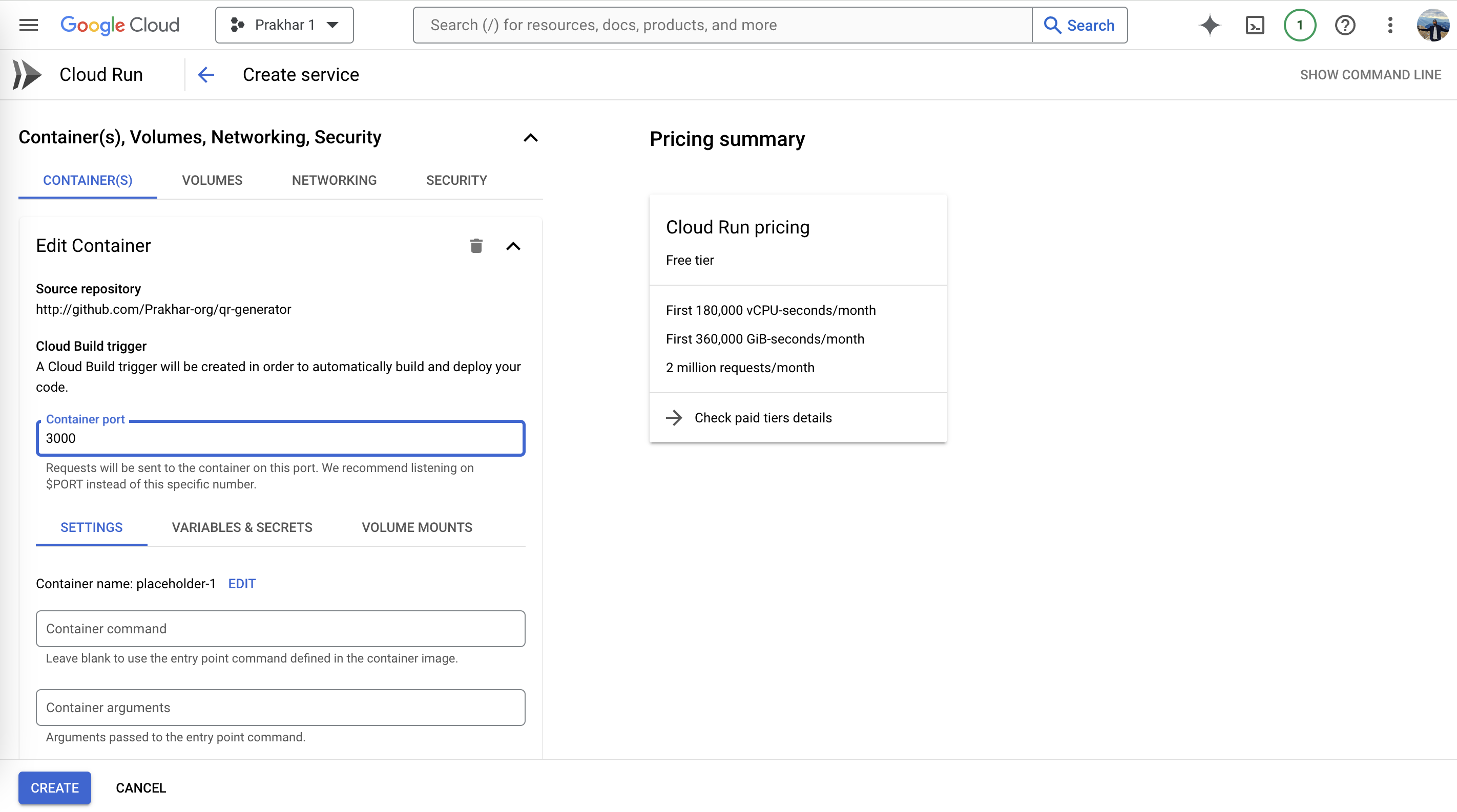 - The last step is to expand the 'Container(s), Volumes, Networking, Security' caret. The first input Container port needs to be updated to 3000. Click the Create button to start the service.