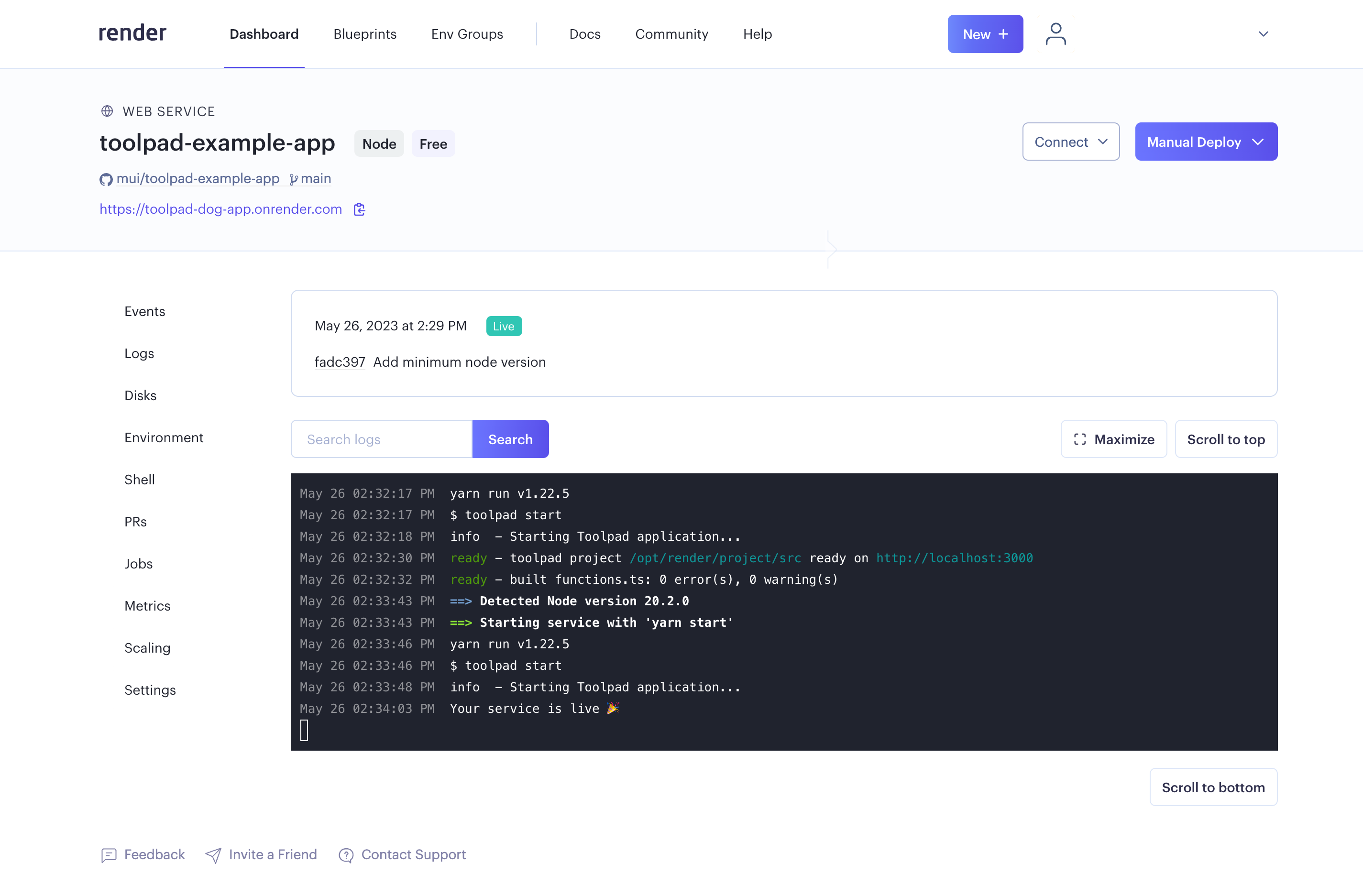 2. Render.com uses 14.7.0 as the default Node version. Toolpad Studio requires version 18.17.1 as the minimum Node version. You can change the default by setting a NODE_VERSION environment variable for your deployment: