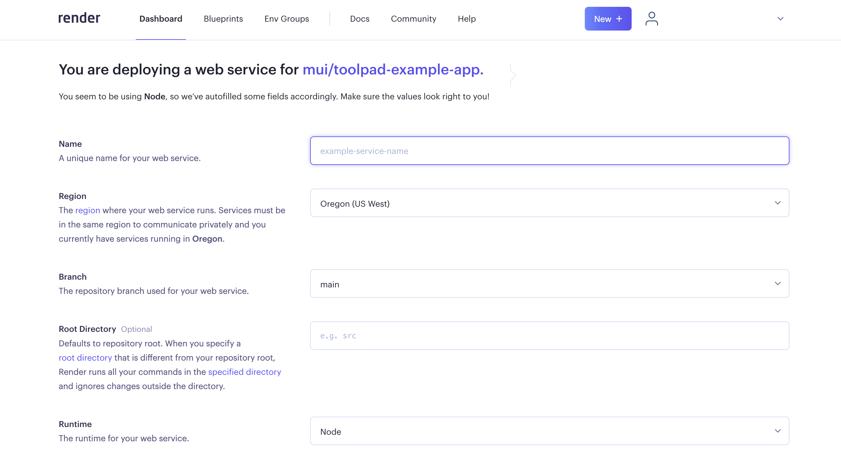 1. With the repository selected, you can advance to deployment configuration. Render can guess that you are deploying a Node app. Set the name which should appear in the URL of your deployed app, like <APP-NAME>.onrender.com: